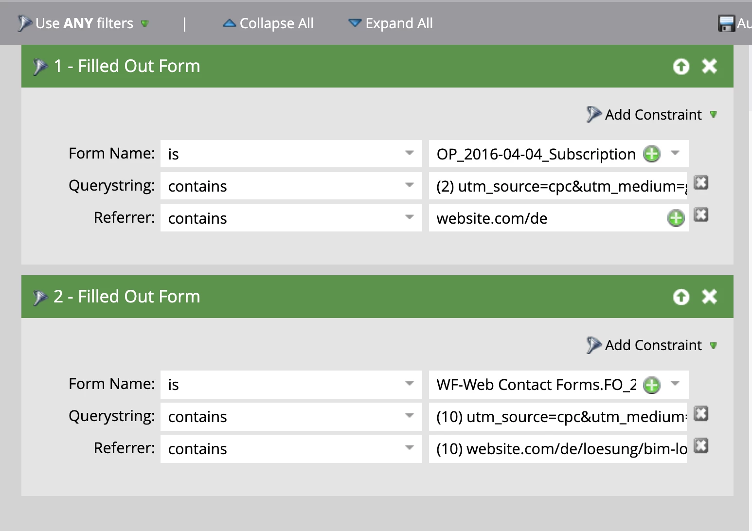 The idea was to set up a smart list with the Filter "Filled Out Form" and add the contraints "Referrer" and "Querysting". In google analytics I see that some have been convertet as a lead, though not in Marketo so the Smart List is most likly not set up right. Any ideas what to change?