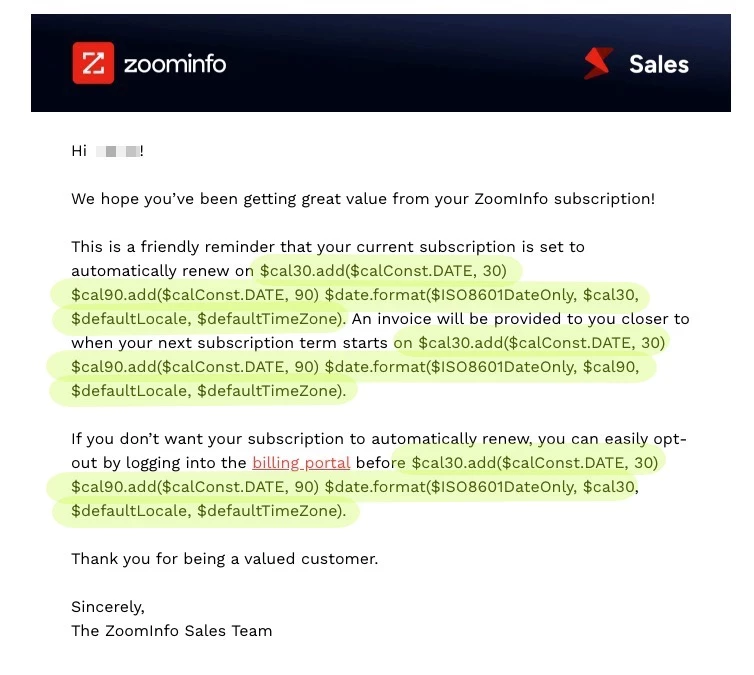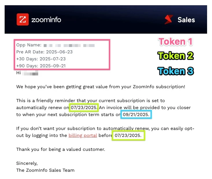 I’m working on an auto-renewal email that pulls fields from a related Opportunity with Velocity in a few tokens (Pre-AR notification date, plus 30-/90-day offsets).