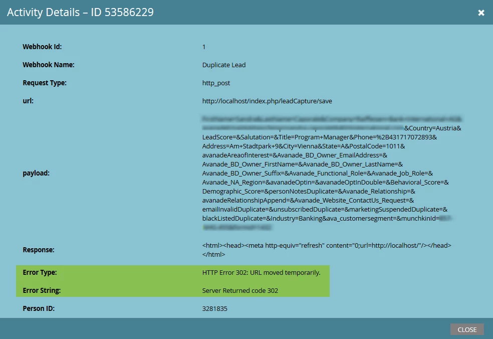 We're finding that this is working very inconsistently for us. Sometimes it works, sometimes it doesn't. What's odd is that we always receive a common error type "Duplicate Lead" Failed. Server Returned code 302" - even when the webhook runs successfully. When I asked Support about this, they came back with the following: