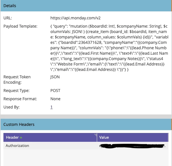 { "query": "mutation ($boardId: Int!, $companyName: String!, $columnVals: JSON! ) {create_item (board_id: $boardId, item_name: $companyName, column_values: $columnVals) {id}}", "variables": {"boardId":2364371628, "companyName":"{{company.Company Name}}", "columnVals": "{\"phone\":\"{{lead.Phone Number}}\",\"text\":\"{{lead.First Name}}\", \"text4\":\"{{lead.Last Name}}\", \"long_text\":\"{{company.Company Notes}}\", \"status4\":\"Website Form\",\"email\":{\"text\":\"{{lead.Email Address}} \",\"email\":\"{{lead.Email Address}} \"}}"} }