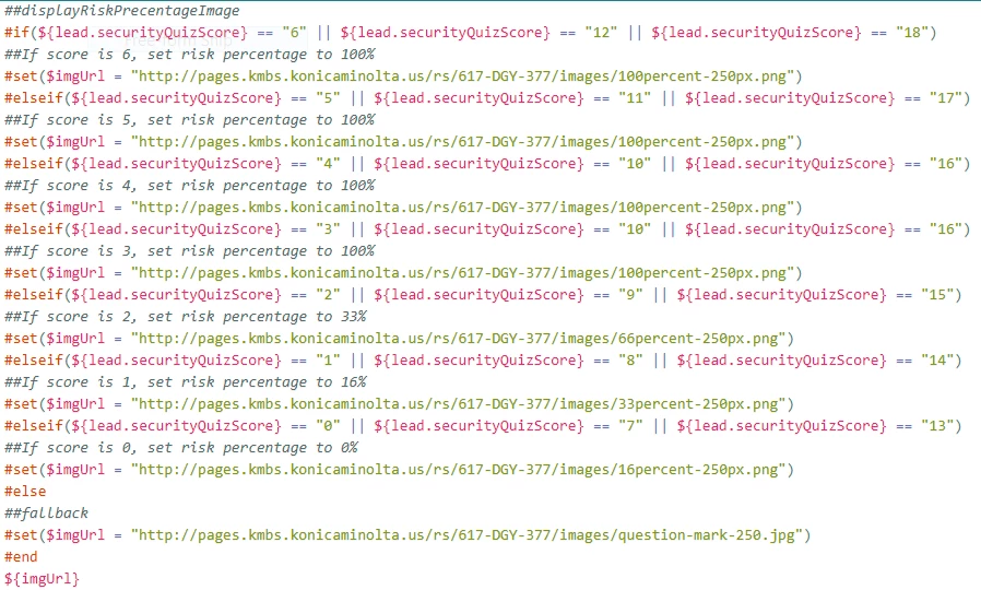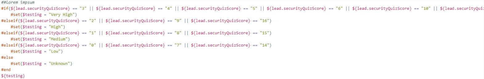 I have a Velocity script that works in one campaign, but not in another one. I'm racking my brain trying to figure out what the heck is happening here. There are two different Velocity scripts that are included in the email I am trying to send out. The way the script is supposed to work is off of a data value, lead.SecurityQuizScore. Below, see a screenshot of a test I just did where the Security Quiz Score value is properly computed (meaning my scoring campaign is functioning) to '2':
