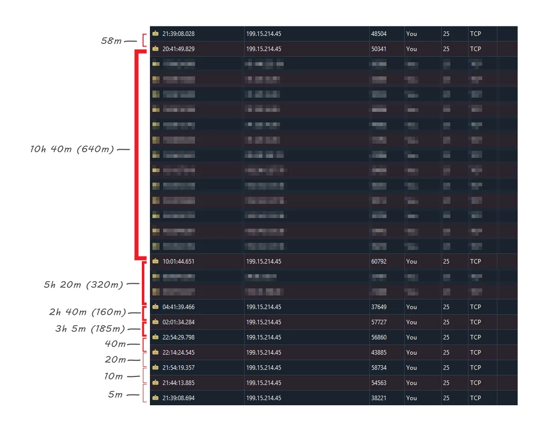 To observe Marketo’s backoff algorithm, I set up a dummy SMTP server that drops every connection before any data is sent and watched the logs. (It doesn’t reject the message itself, because you don’t want an immediate Hard Bounce. It just says “Yes, I’m here, but go away for now.”)