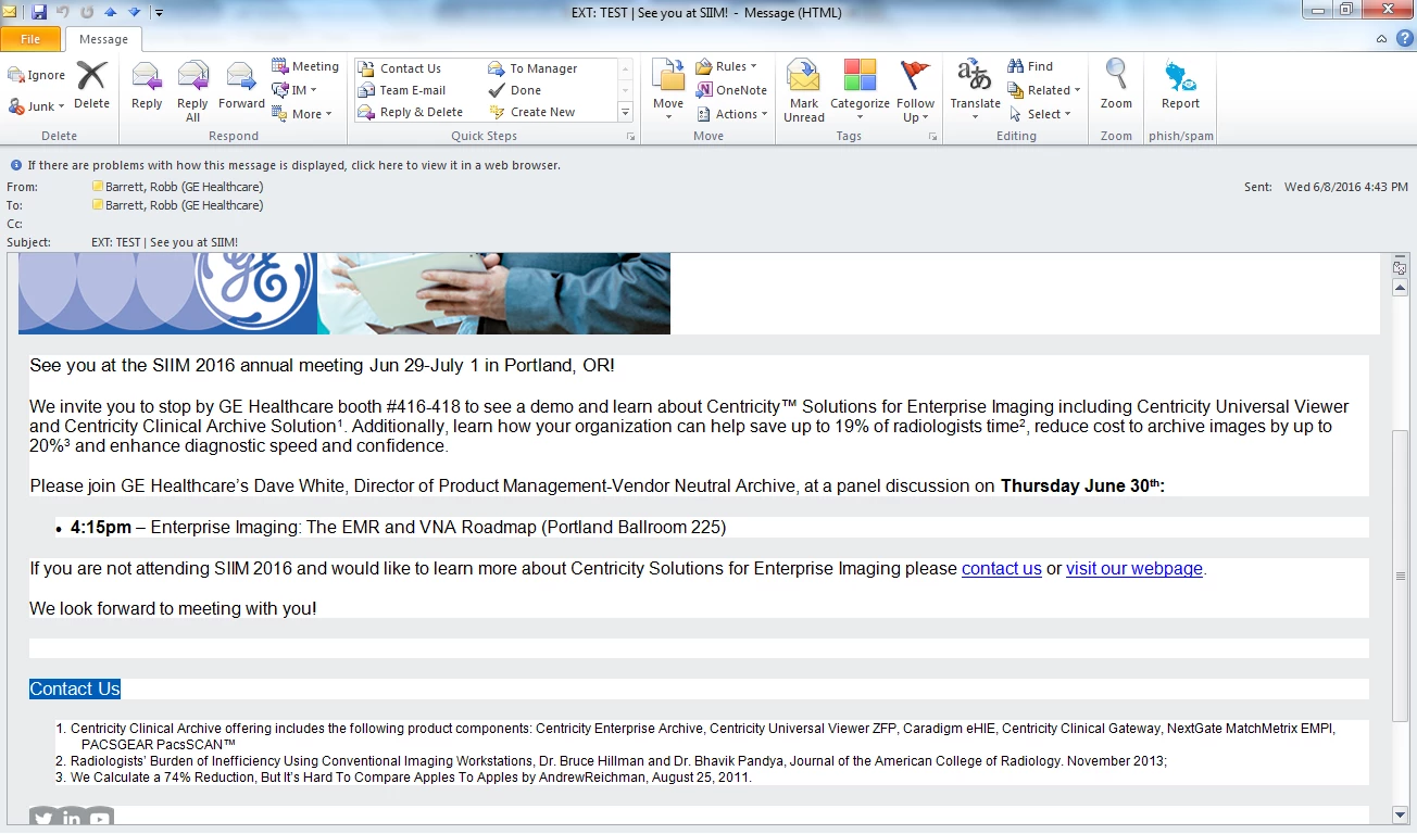 This has been irking me. I'm in B2B and estimates are that about 80% of B2B folks use Outlook for email. As everyone knows, Outlook is the IE of email browsers. I can have an email looking pretty as a picture in my email editor and then send it to Outlook and it becomes a mangled mess. For example, why in <insert deity here>'s Good Name would I purposely approve an email that I know will look like this in Outlook?