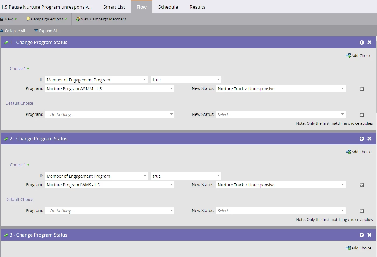 I am working on our engagement programs. I want to pause leads that are not active for for 60 days in our engagement stream and change their program status to unresponsive. I have build a smart campaign that is scheduled every Sunday to check which leads did not respond for 60 days. The flow looks like this: