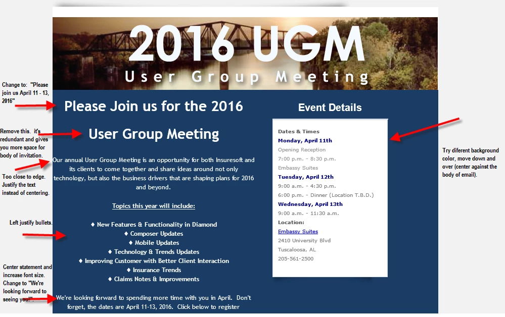 I am testing an invite email. When I send out the sample, why does the sample's format appear to look different when what I have in Marketo? Is there a way to fix that in Marketo? I've attached a few images for a visual explanation of the formatting issue.