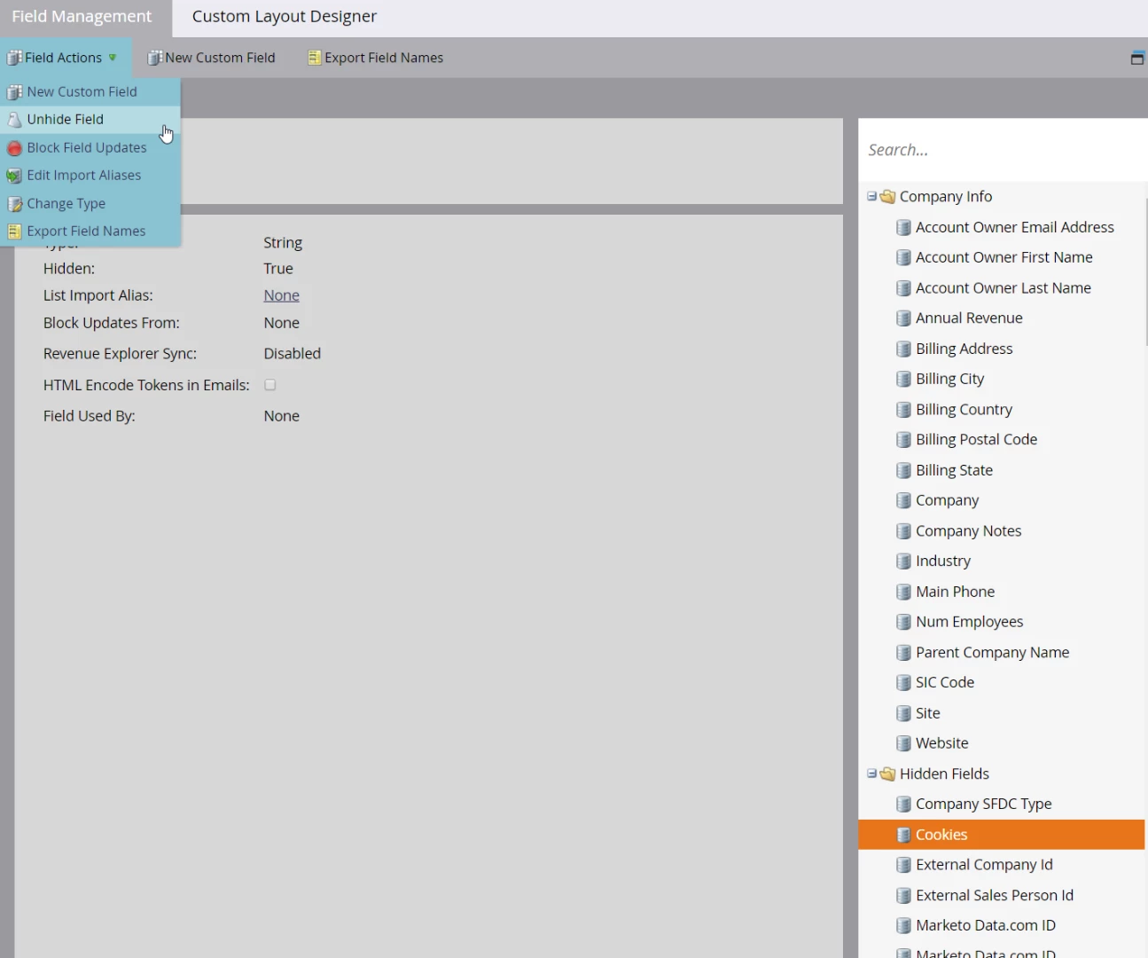 Why is it failed to unhide fileds "Cookies" in Field Management?