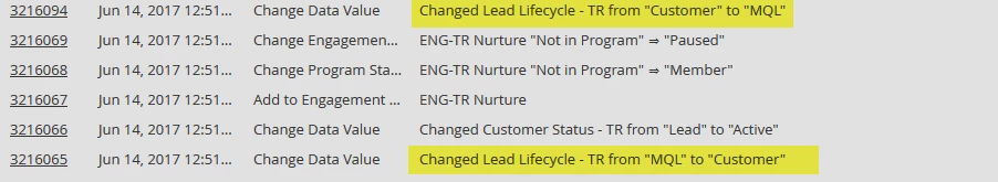 Your screenshot shows Change Data Value, but because your question is about a lifecycle I would expect to see Marketo changing a revenue stage in a Revenue Cycle Model. Curious if you are changing data values to drive a Marketo RCM, or if you're simply tracking a lifecycle using only custom fields.