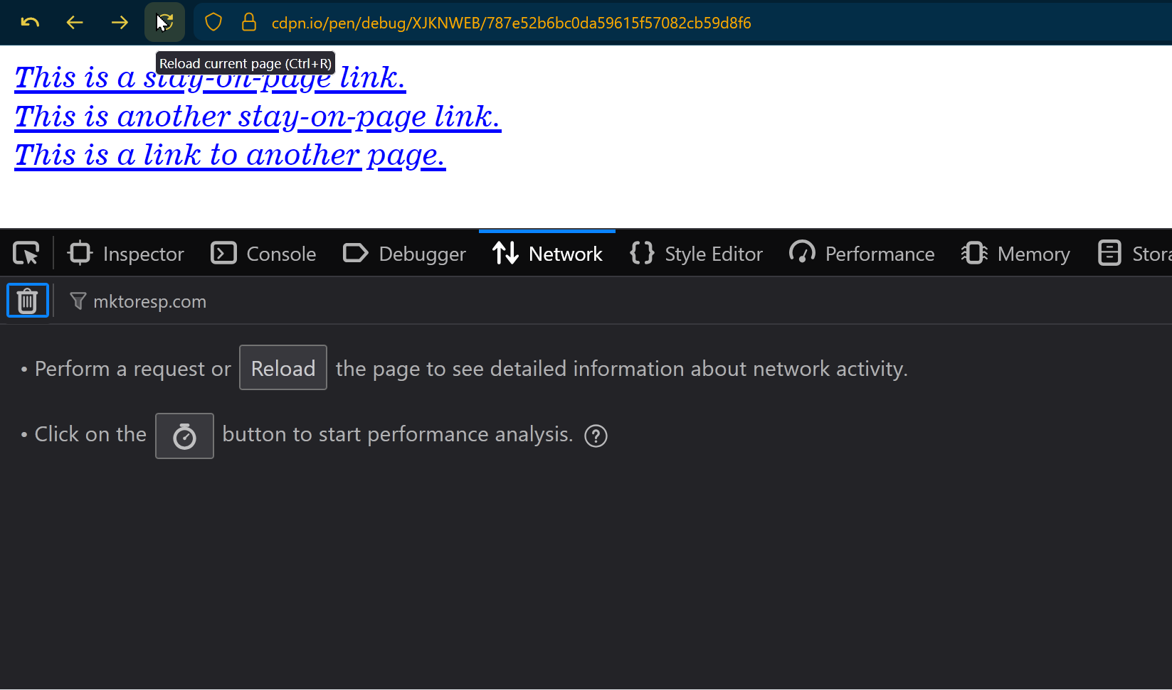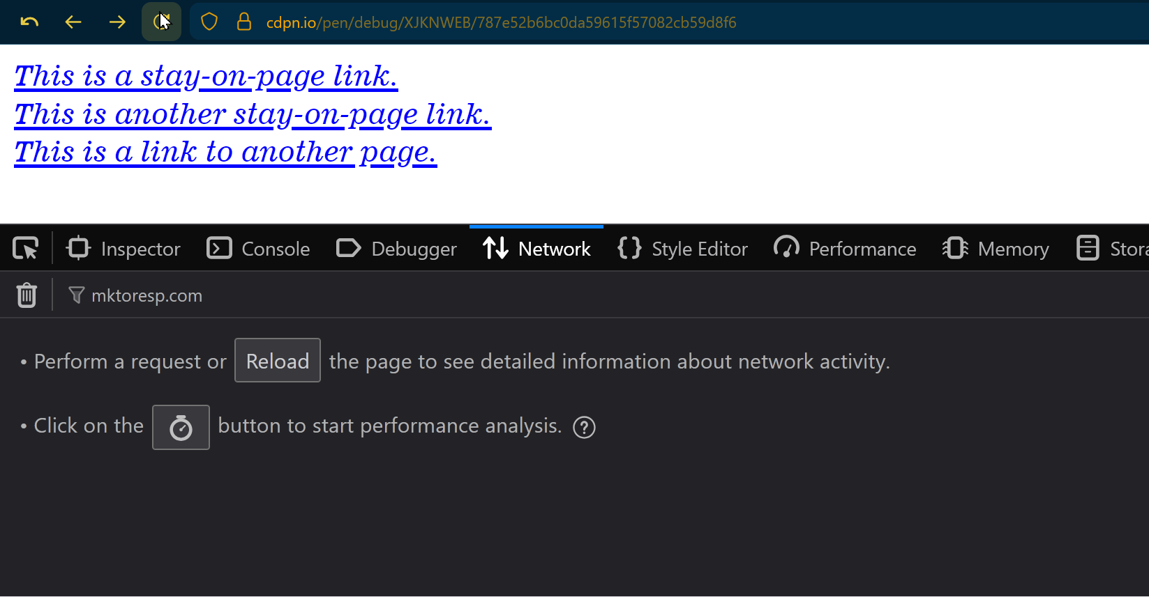 The initial visitWebPage fires, as do clickLink events for the top 2 internal links. When I click the 3rd off-page link (“This is a link to another page”) there’s a clickLink for that, too. Then I use the back button on my mouse (you can’t see that!) to return to the initial page. Upon returning, no events are fired, though I’m interacting with the same links.