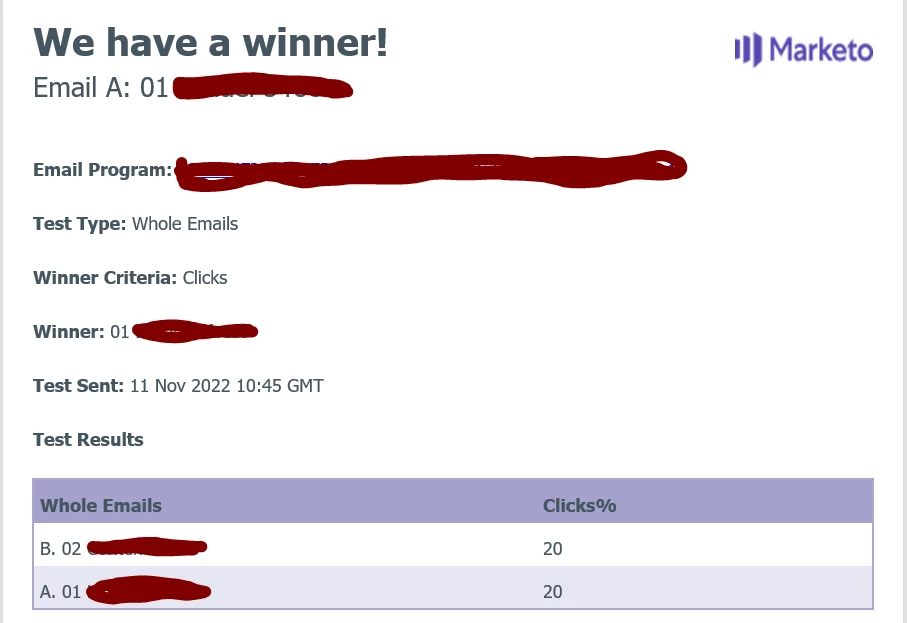 But in the final report Marketo has declared an email as winner with winning criteria as Clicks.