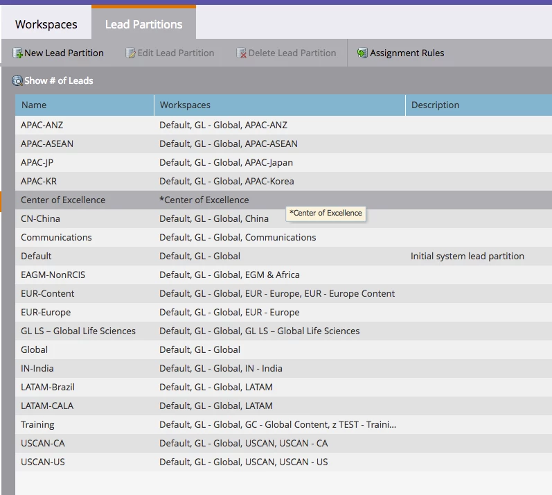 Also you can share the partition over the multiple workspaces. So if you want all the leads to be in your Global or Default workspace you can share that as well.
