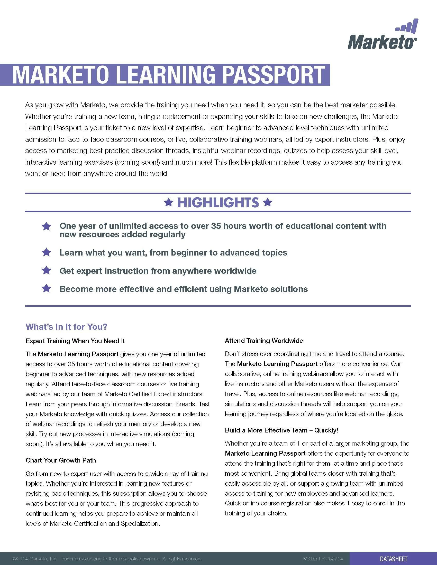 Introducing Marketo Learning Passport. It gives you the training you need when you need it, so you can be the best marketer possible. Learn beginner to advanced level techniques with unlimited admission to face-to-face classroom courses and collaborative training webinars all led by expert instructors. Plus, enjoy access to marketing best practice discussion threads, insightful webinar recordings, quizzes to help assess your skill level, interactive learning exercises (coming soon!) and much more!