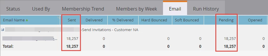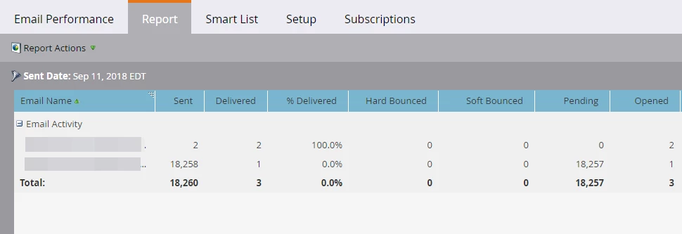 影響のあったキャンペーンを特定するには、障害が発生した日付で配信済み、ハード・ソフトバウンスが0、送信済みと保留中の数が等しいかどうかをご確認ください。以下は一例です: