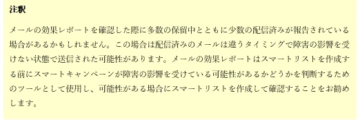 - それ以外のバッチキャンペーンではメールは送信済みで、かつ配信済みとなっているものとそうでない(配信済みが記録されない)ものが混在している状態となります。このように少しでも配信済みが記録されている場合はそのキャンペーンのメールはすべて正常に配信されています。