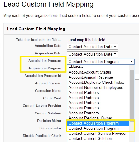 1. Create three custom fields in Salesforce on the lead and contact objects: Lead Score, Acquisition Program, and Acquisition Date.