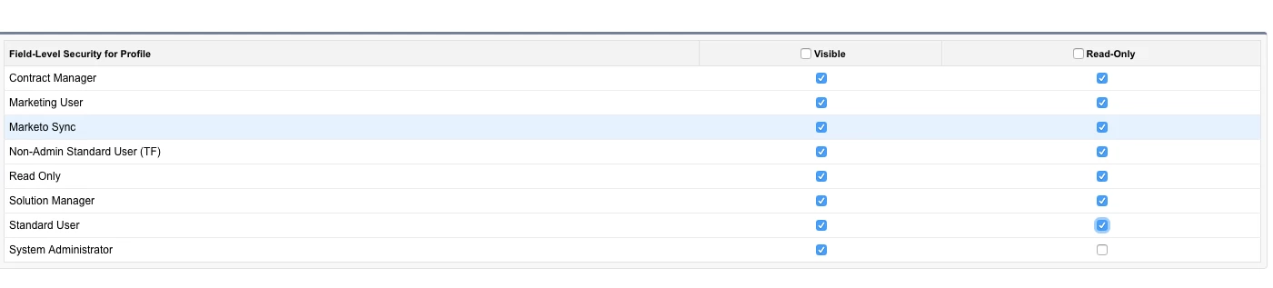 I'm still a little fuzzy on this. So I should uncheck read only for the highlighted "Marketo Sync" profile as well as system admin? See below.