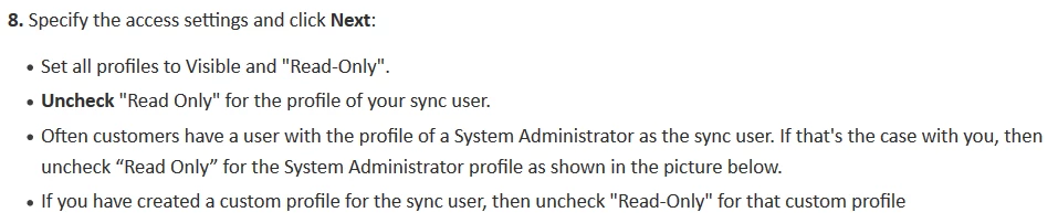 Whichever profile the sync user is using, that's the one that will need write access for the profile. Some customers just use an admin profile, others have a dedicated sync user profile. Whichever one you're using, that's the one that needs the write access. In step 8 above, you'll see this note: