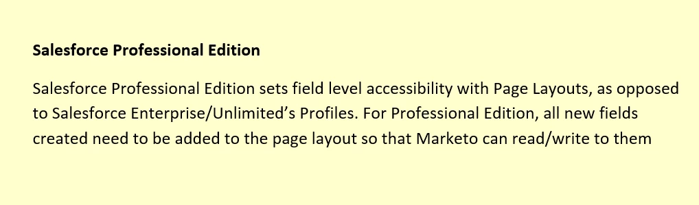 Essentially the process of adding fields into SFDC Professional Edition is the same as for Enterprise. The big difference is that with Professional Edition, the fields must be added into the Lead & Contact page layouts in order for Marketo to be able to pass data to them.