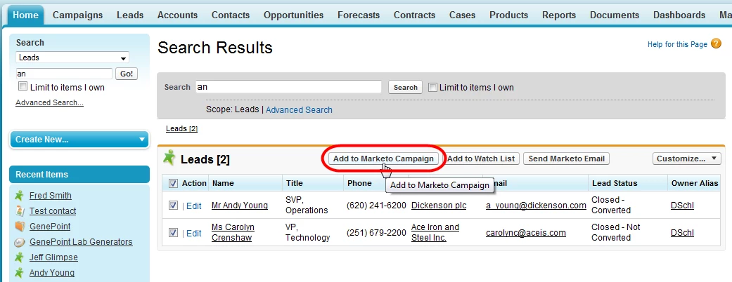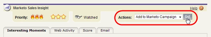 To add a lead or contact to one of these campaigns, go to that person's detail page and find the Actions menu in the Marketo Sales Insight section. Pick Add to Marketo Campaign and click Go: