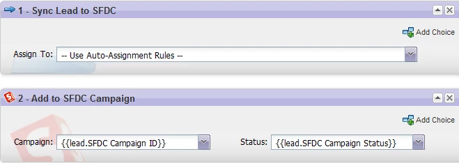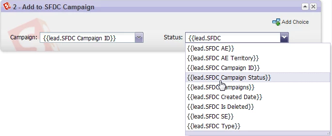 Then you can add it to the Salesforce campaign using the values in the SFDC Campaign ID and SFDC Campaign Status fields. To do this, use the tokens for those fields in your flow step: {{Lead.SFDC Campaign ID}} for the campaign name and {{Lead.SFDC Campaign Status}} for the status. If you type "{{" in the fields, the auto-suggest will help you enter that text correctly: