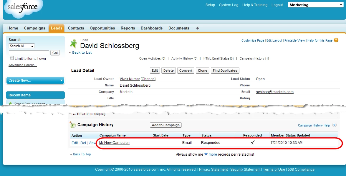 If you modified a form already in use, you can now go to that landing page, fill out the form, and watch as your lead gets synced to the Salesforce campaign you chose. If this is a new form, create and approve a new landing page which uses that form. After filling out the form, you should see the lead added to the default Salesforce campaign specified in your form: