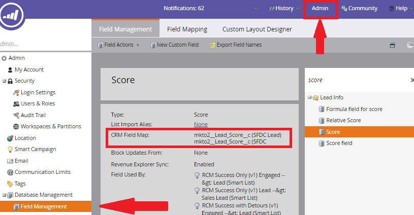 • In the next sync cycle, Marketo detects that this field has been created and automatically maps it to the Lead Score field in Marketo.