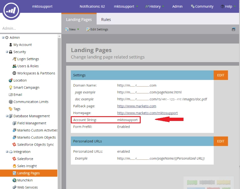 In your Marketo instance, navigate to Admin > Landing pages. You’ll see your Account String listed right in the middle of the screen.