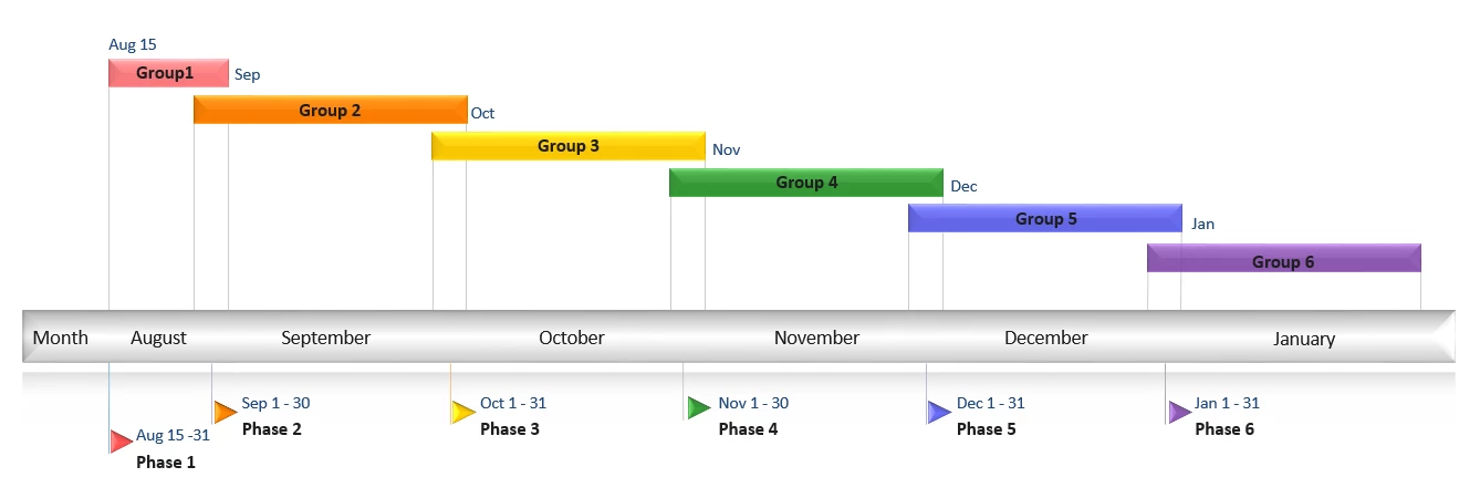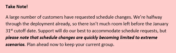 The customer base has been split into the following groups with times scheduled for deployment.