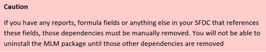 Uninstalling the MLM package deletes fields, data and workflows created by the package. Any dependencies like for reports or workflows inside of SFDC that you have created based off of these fields will need to be removed manually. If these other custom dependencies exist, they’ll need to be removed before uninstalling the MLM package.