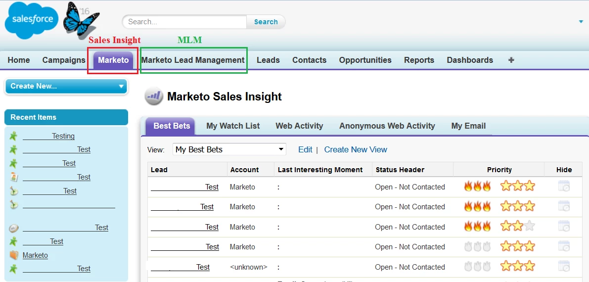- The Sales Insight tab is the tab labeled “Marketo”.