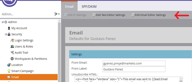 1. In the Email section within Admin, select the ‘Edit Email Editor Settings’ option. The application will display a dialog window and indicate the email editor configured for your Marketo subscription, as in the image below:
