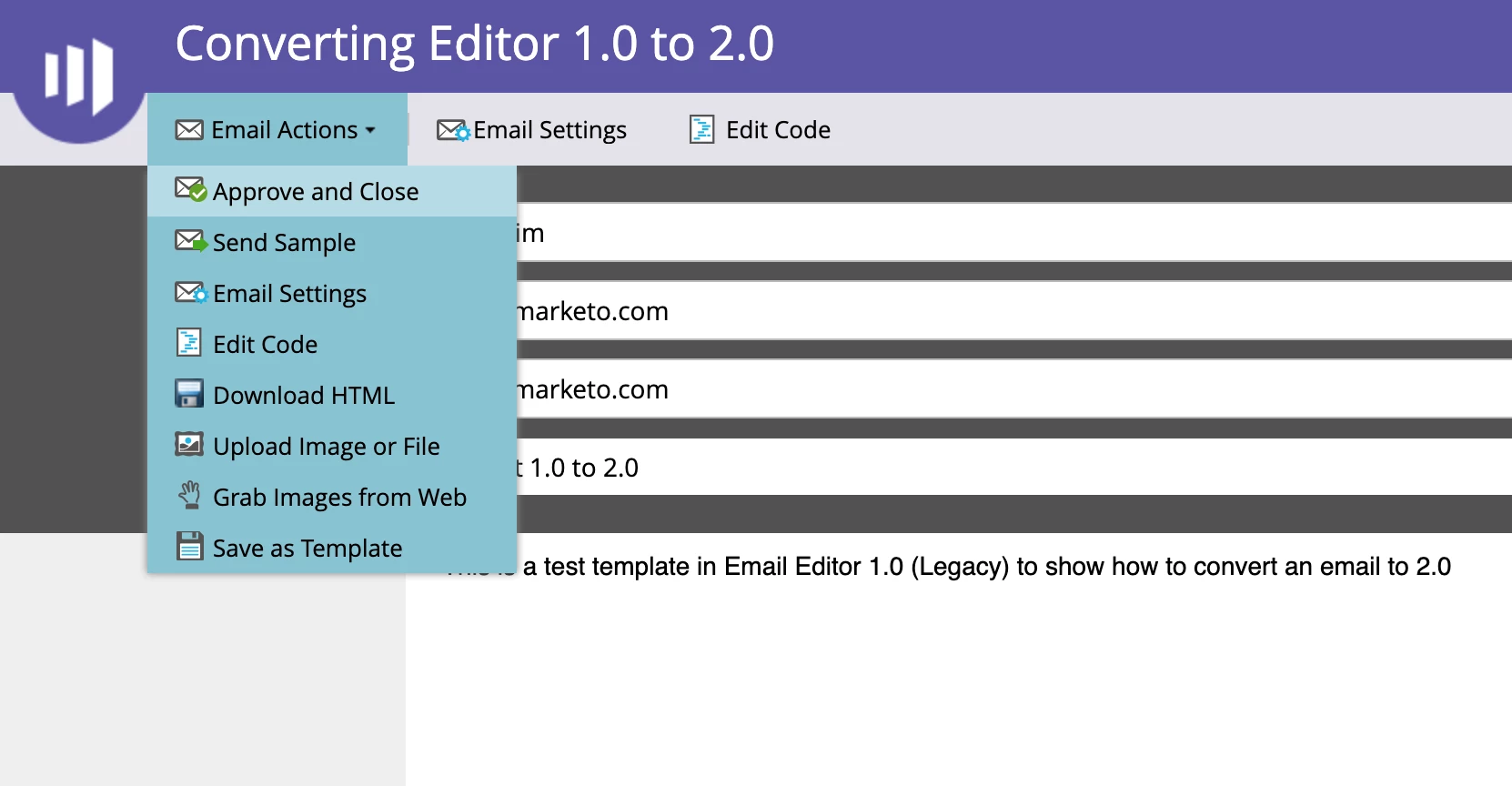The ability to use the Legacy Email Editor 1.0 will be removed from the UI on June 18, 2019. Any emails created or edited after June 18, 2019 will automatically open the new Email Editor 2.0 version. Note that the Marketo APIs (Direct Writes & Clone Programs) will issue warning notifications to help you identify assets still needing to be upgraded to Email 2.0.