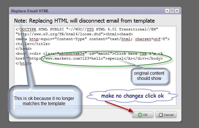 This happens because the editor cannot associate the unique "mktedtable" divs from the template to the email. When creating a template, each section that can be changed will have a class of "mktEditable" and a unique "ID".