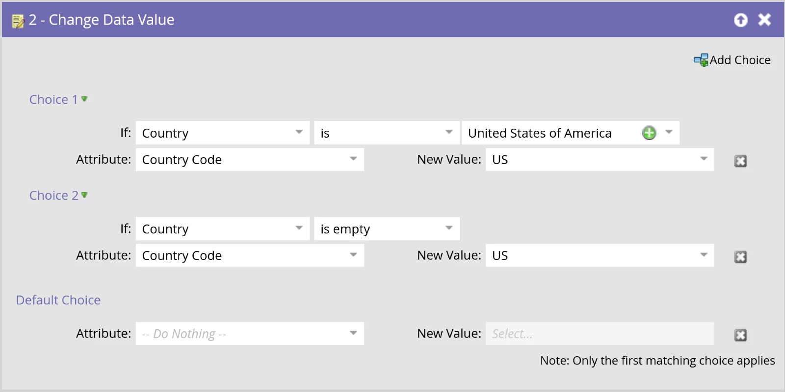 The above is an abbreviated example using flow-step choices to match the value of Country to a particular country code. Supposing we wrote a test for this, we would expect a lead who enters the flow with an empty value of “United States of America” to receive a Country Code value of “US”.