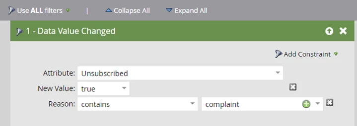 You can use the following filters to find leads that have clicked the SPAM button in your emails: