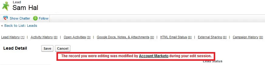 You or your sales reps are getting an error when editing your leads or contact records in Salesforce saying "The record you were editing was modified by Account Marketo during your edit session". Similar to this: