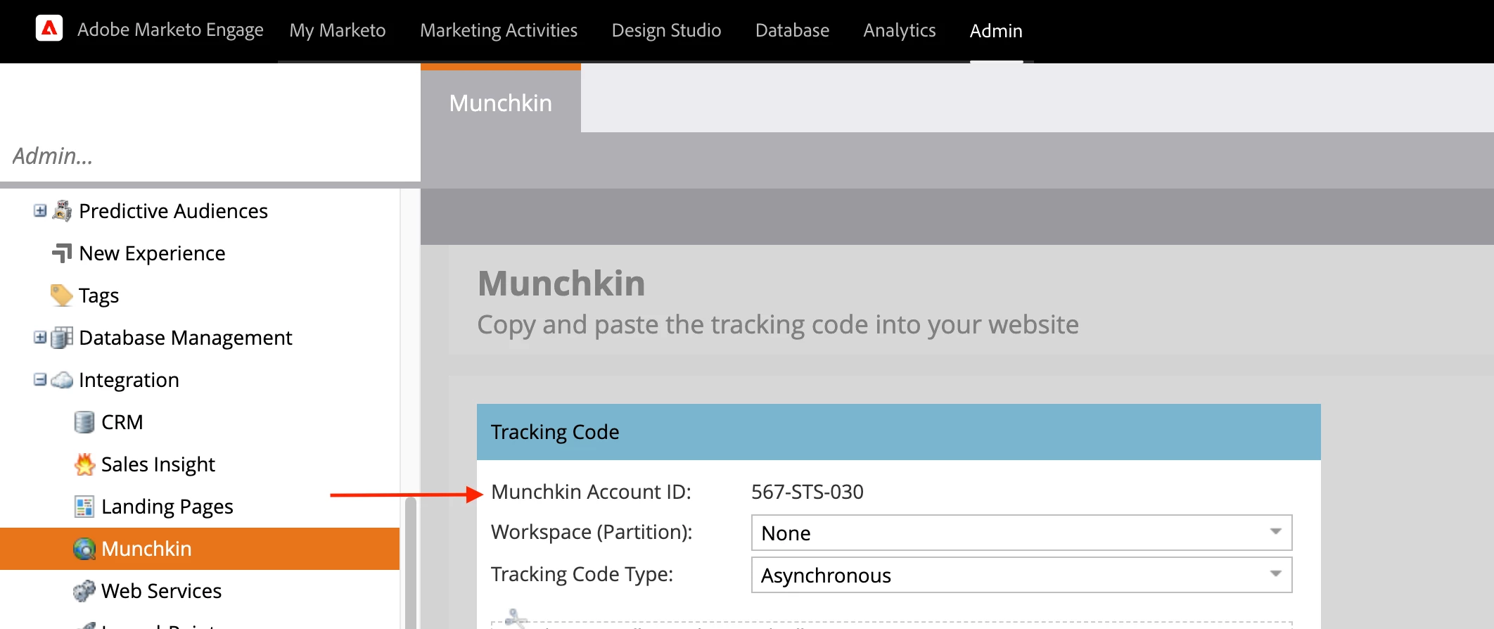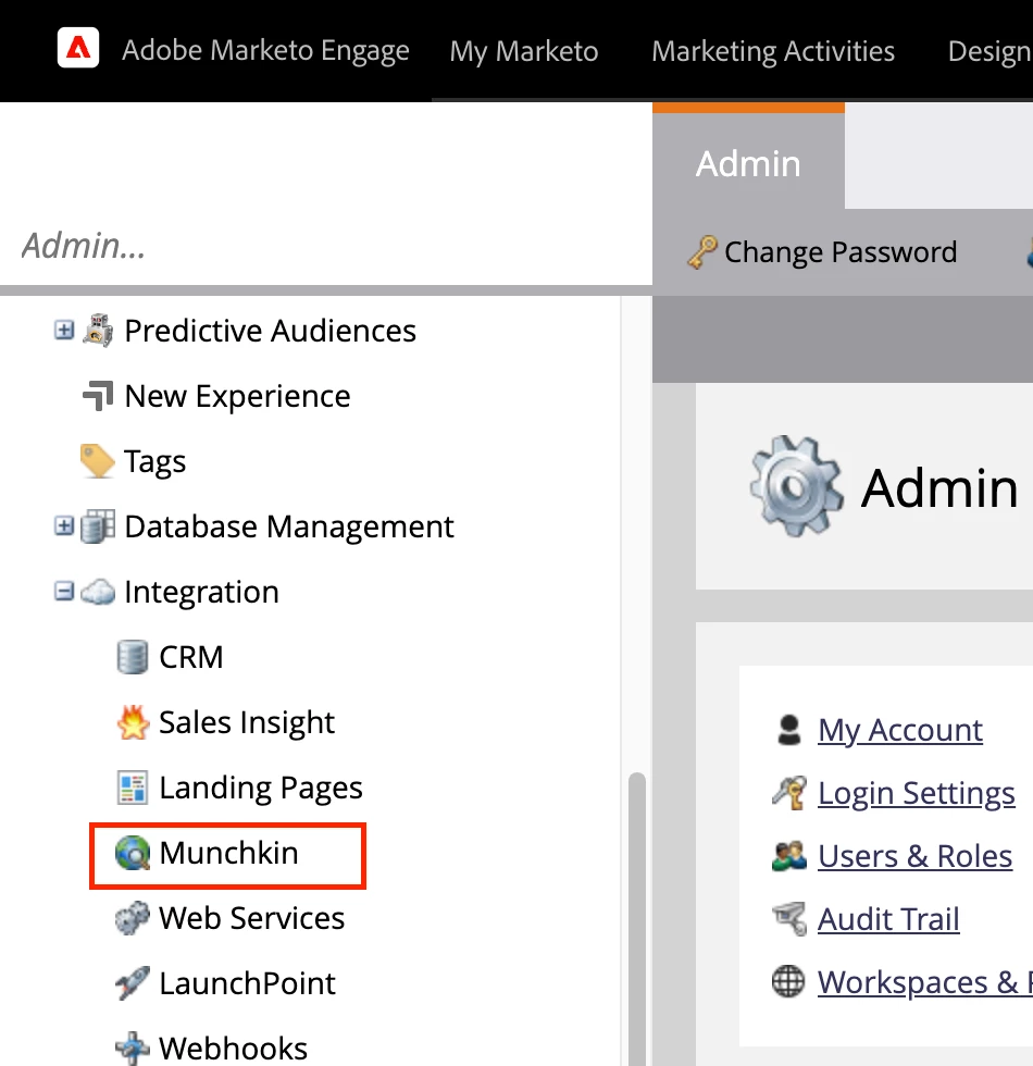 2. Go to Admin and click Munchkin in the tree on the left in the Integration section.