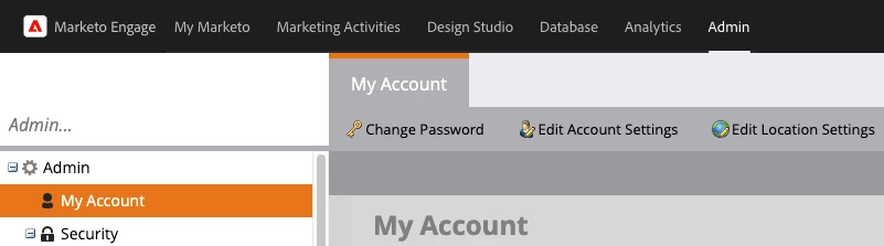 Prior to selecting a regional location(s), you will want to identify what data center and pod/server your instance is located in. You can access this information from the Adobe Marketo Engage Admin tab. After clicking on this tab from the menu at the top of the page, select My Account on the left rail: