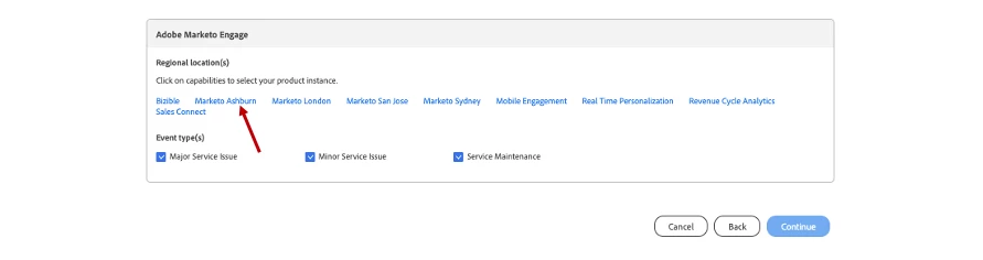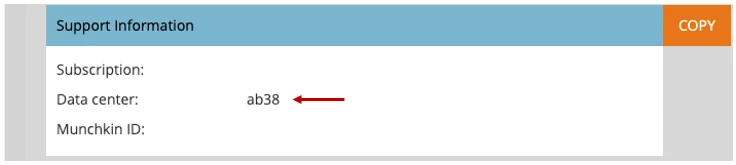 The example above indicates that this instance is in our Ashburn data center on pod 38. This user would select the regional location Marketo Ashburn, and then pod AB38, as shown below.