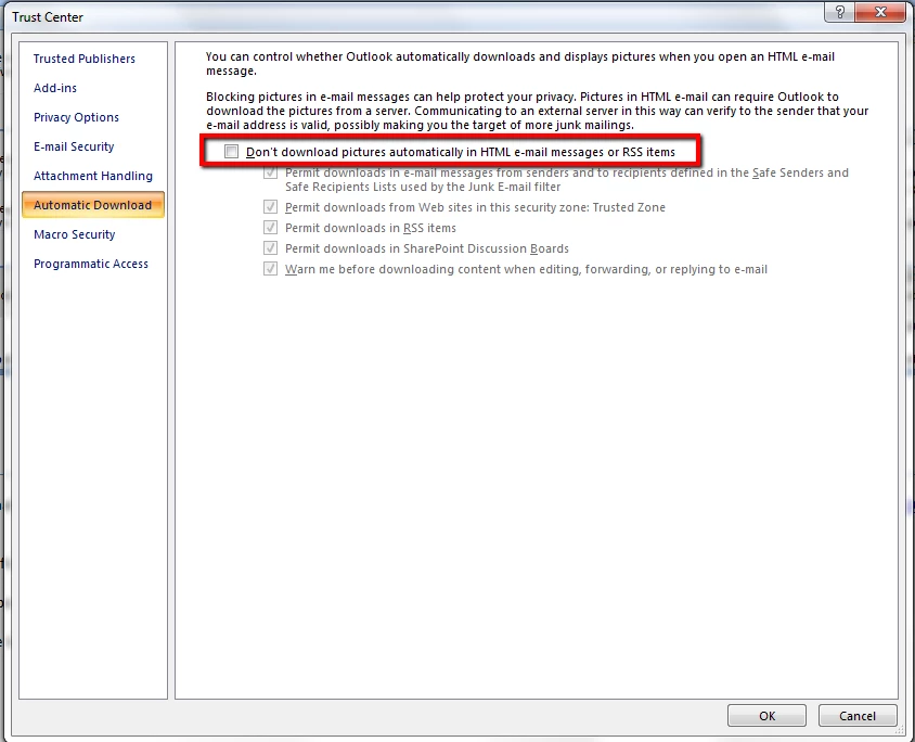 3. Uncheck the box, ‘Don’t download pictures automatically in HTML e-mail messages or RSS items’.