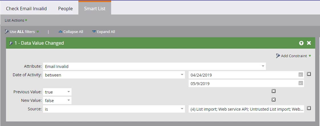 Once the cause was identified, our team developed and deployed a patch on May 8, 2019, to revert the changes that introduced this issue. To correct the data that was affected during the impacted timeframe, our team is scoping and designing a bulk data fix process with the highest urgency. We expect this process to take two weeks to complete, with an anticipated end date of May 28, 2019. You can also choose to manually fix the affected data by creating the smart campaign outlined below. If this option is chosen, the data fix being done by our team will not interfere with the corrected values.