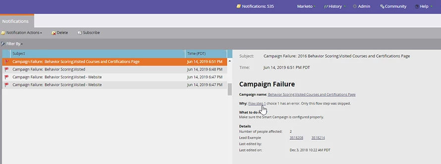 3. If the failed campaign contains score changes, then only the Change Score flow steps failed. Every other flow step in that campaign would have worked correctly. You will need to re-run the Change Score flow steps for the leads listed in the campaign failure notification.
