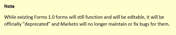 - Form Editor 2.0: Create all your new web forms with the Form Editor 2.0, giving you an improved WYSISYG editor, the ability to create draft forms and more. We’re deprecating the older Form Editor 1.0, making Form Editor 2.0 the way you’ll create all new forms in Marketo. Any forms previously created in Form Editor 1.0 will remain functional and editable, however these v1.0 Forms will no longer be officially supported by Marketo. To continue receiving support for your Marketo forms, we encourage you to create new forms in Form Editor 2.0 to replace your v1.0 forms.