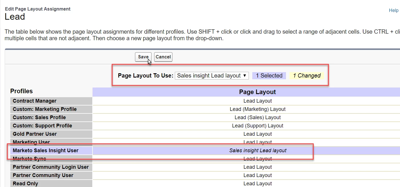 Follow the instructions in the Installation guide for configuring the lead detail page.Installing the Marketo Sales Insight AppExchange packageGo back to the Page Layouts section and click the Page Layout Assignment button.