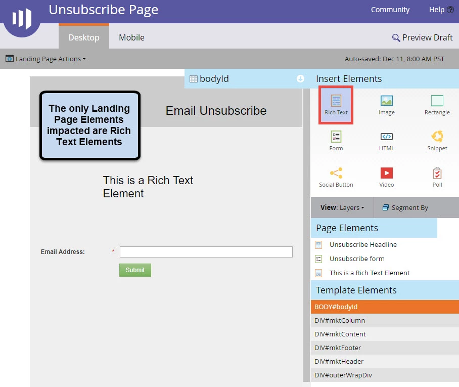 Landing Page Elements Impacted – Rich Text Elements