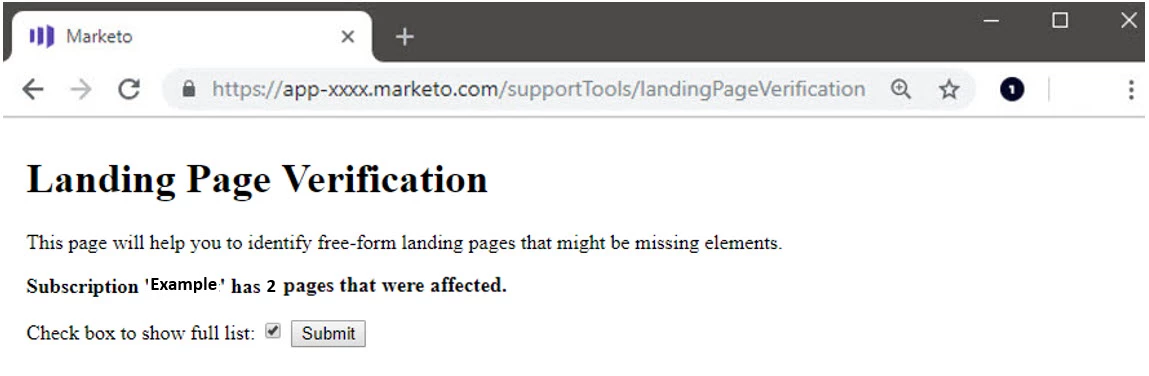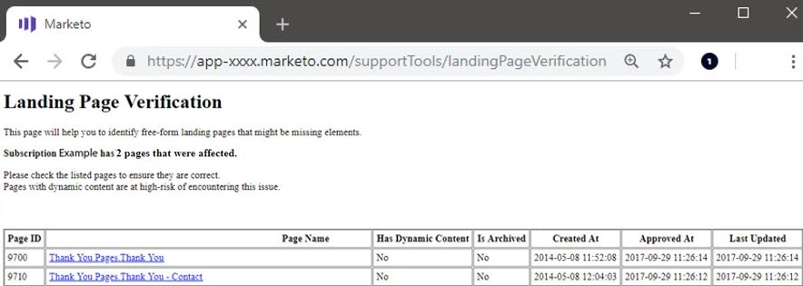 Marketo recognizes that correction of this issue will take investigation. To help you identify pages that could have been impacted, we have built a new Landing Page Verification utility as a resource for you. The Landing Page Verification utility is a new back end utility that was developed specifically for this purpose. Since it is a back-end utility, it is not polished the way that products are inside the Marketo UI. However, it will identify all landing pages in your Marketo instance that could have been impacted by this service issue.