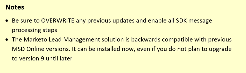 - Documentation on how to upgrade the Marketo Lead Management solution for MSD can be found here: Upgrade the Marketo Solution for Microsoft Dynamics