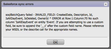 soqlBatchQuery failed - INVALID_FIELD: CreatedDate, Description, Id, IsAllDayEvent, IsDeleted, OwnerId ^ ERROR at Row:1:Column:70 No such column 'IsAllDayEvent' on entity 'Event'. If you are attempting to use a custom field, be sure to append the '__c' after the custom field name. Please reference your WSDL or the describe call for the appropriate names.