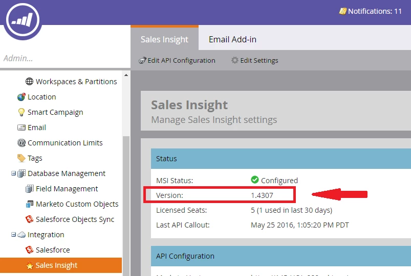 To check what version of MSI you’re currently using, navigate to Admin > Sales Insight, then look for the Version info in the Status box in the middle of the page.