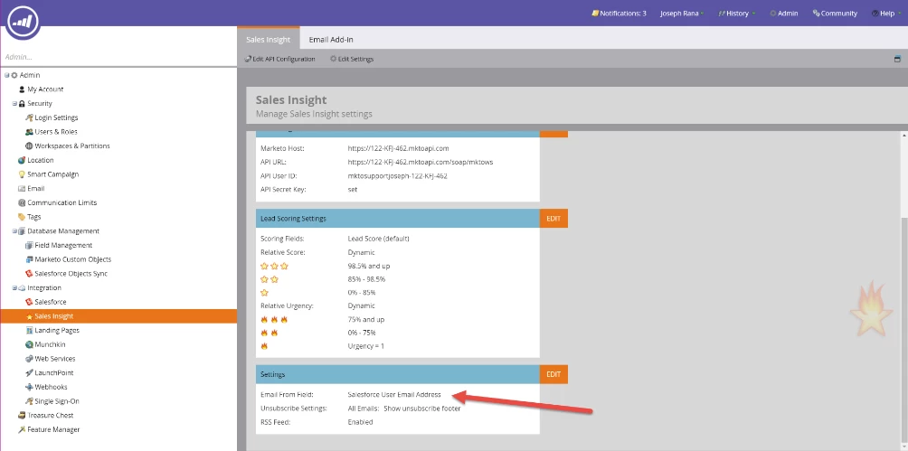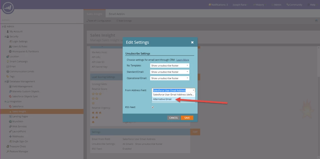 Go to Marketo > Admin > Sales Insight. If you scroll down to the bottom of the module, you will find a Settings section with an ‘Email From Field’ field. By default, the initial and only value will be Salesforce/MSD User Email Address (depending on the native CRM integration used by the customer).