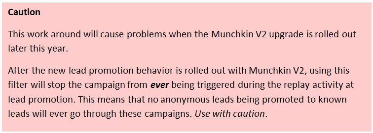 This solution will not require any changes after the Munchkin V2 roll out later this year. Since the campaign replay process on lead promotion does not execute Send Alert flow steps (described in Anonymous Lead Promotion to Known Lead – Munchkin V2 Behavior and Anonymous Lead Upgrades – Under The Hood), that replay process will not be affected.